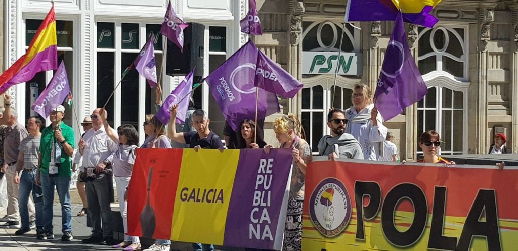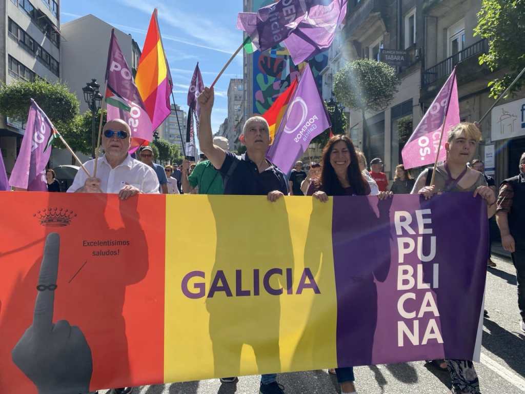 A militancia de Podemos Vigo berramos con forza moitos de lemas da marcha como: Queremos República e loitaremos por ela, Referendo Xa, Monarquía e Capital, alianza criminal, Os borbóns son uns ladróns, Patriarcado e monarquía a mesma porquería…