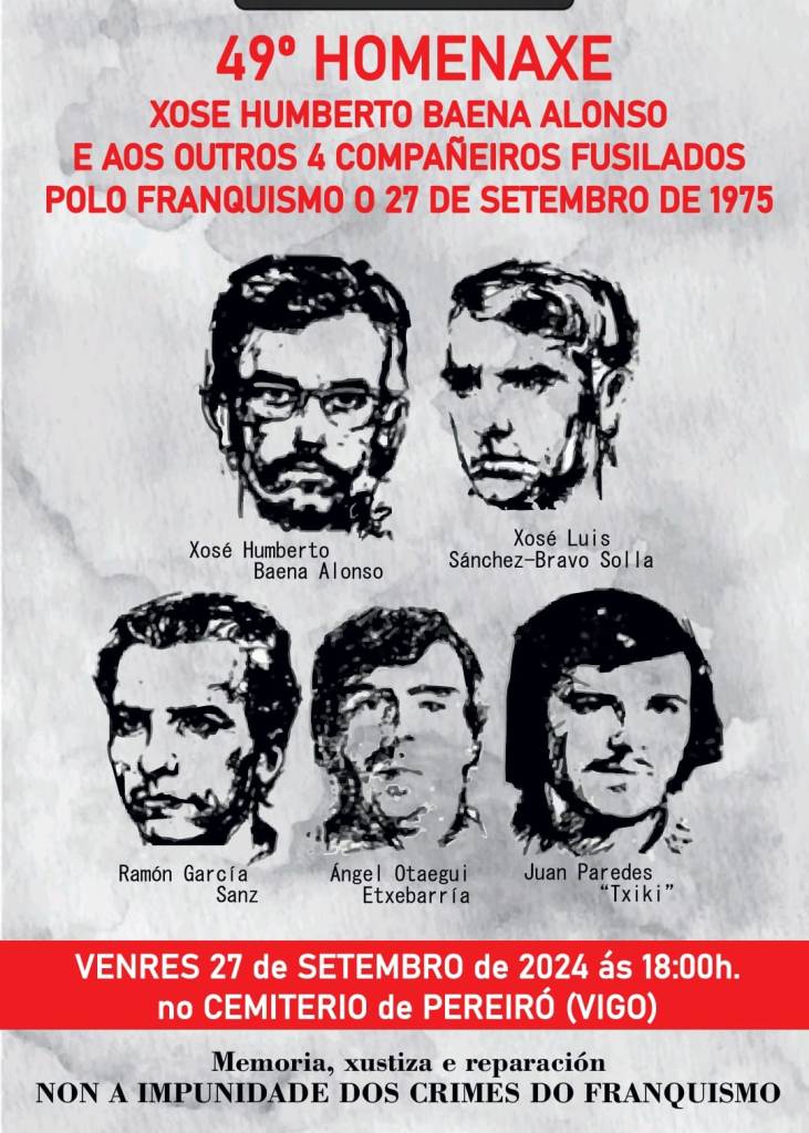 O pasado venres 27 de de 2024, o cemiterio de Pereiró en Vigo converteuse no punto de encontro para render homenaxe a Xosé Humberto Baena Alonso e a outros catro compañeiros asasinados polo franquismo: José Luís Sánchez Bravo Solla, Anxo Otaegui Etxebarria, Jon Paredes Manot “Txiki” e Ramón García Sanz. Ás 18.00 horas, unha morea de amigas, amigos, compañeiras/os e simpatizantes congregouse para lembrar a valentía destes militantes antifranquistas, cuxa loita pola liberdade segue sendo un referente na memoria colectiva.