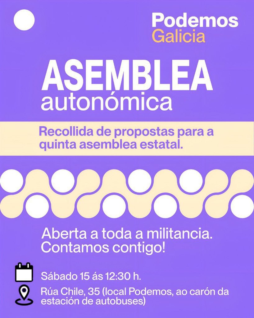 Estamos ás portas da Quinta Asemblea Cidadá Estatal, un momento fundamental para o futuro de Podemos. Por iso, este sábado 15 de marzo de 2025 ás 12:30 h, convidámosvos a un encontro aberto á militancia no local de Podemos A Coruña, onde contaremos coa presenza de Julio Rodríguez. Será unha oportunidade para debater, compartir ideas e construirmos xuntas o camiño a seguir. Agardámosvos!