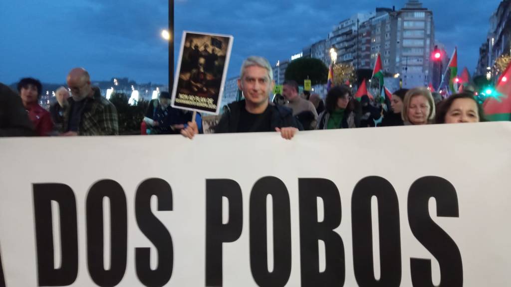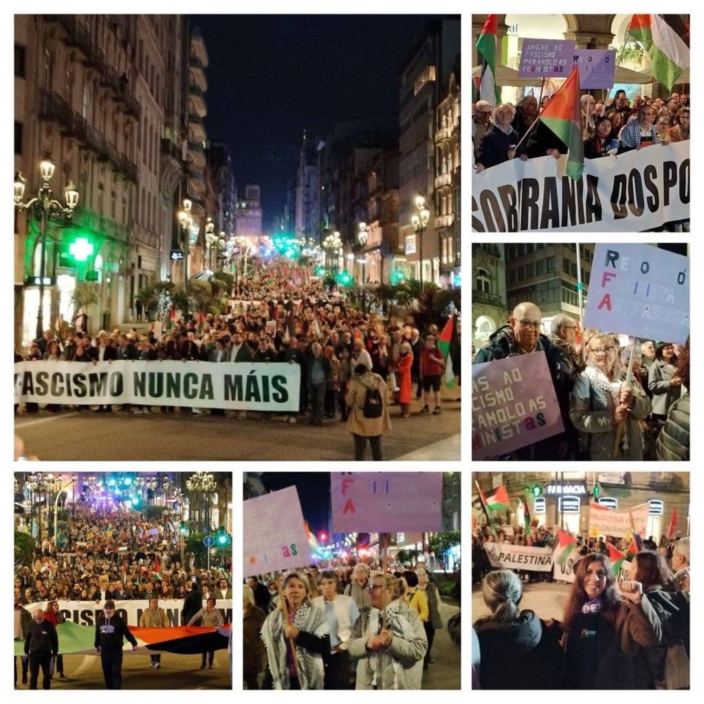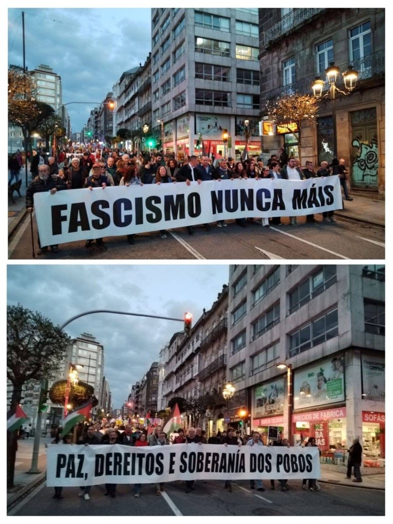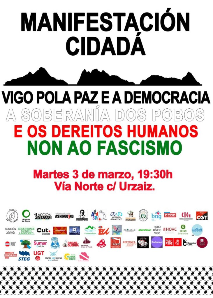 Saímos á rúa xunto máis de cincuenta colectivos sociais e máis de 1500 persoas comprometidas coa paz, o antiimperialismo e o antifascismo. Mobilizámonos para dicir non ao fascismo, non á guerra e non á vulneración do Dereito Internacional. Defendemos a soberanía dos pobos e unha paz con xustiza, baseada no respecto aos dereitos humanos e na solidariedade internacional.