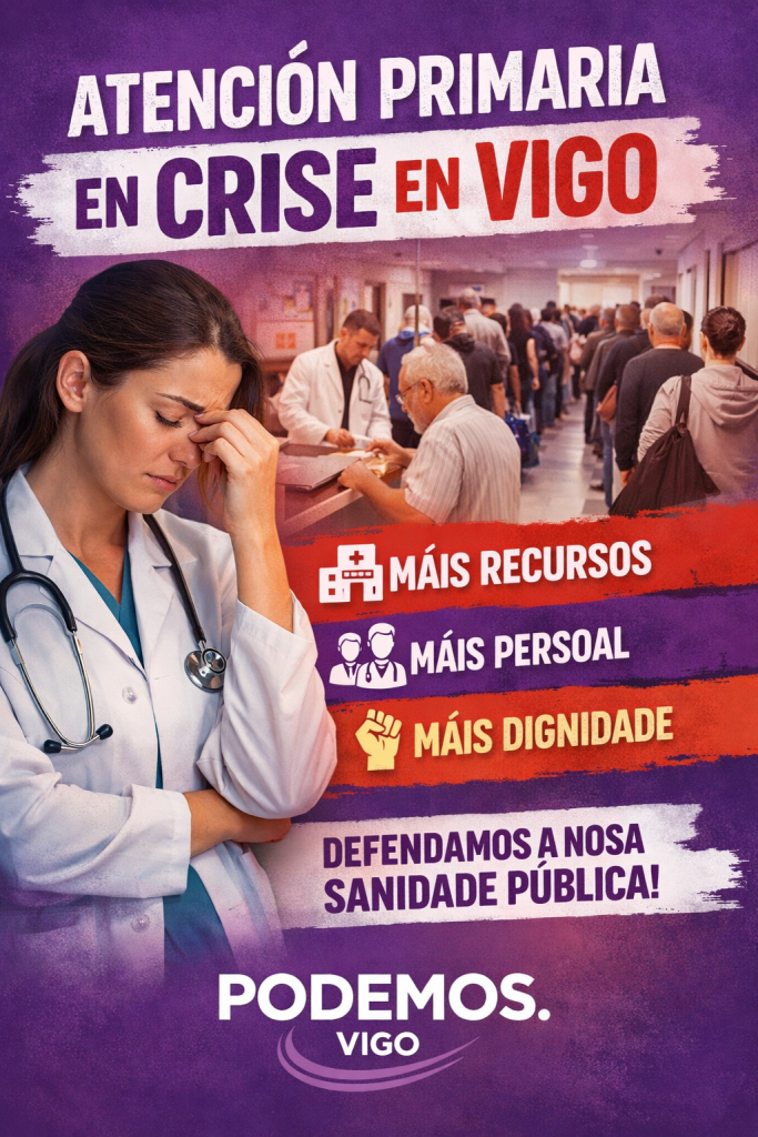 Desde Podemos Vigo defendemos unha Atención Primaria forte, con máis profesionais, menos burocracia e tempos de consulta dignos para pacientes e sanitarios. A saúde pública non pode seguir sendo o elo débil do sistema sanitario. É hora de reforzala e poñela no centro das políticas públicas.