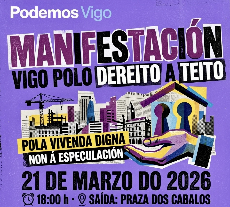 Por iso, desde Podemos Vigo apoiamos con total firmeza a mobilización convocada pola Alianza pola Vivenda e Plataforma Galega, Vivenda Xa! este 21 de marzo ás 18:00 h desde a Praza dos Cabalos. Vigo necesita unha resposta colectiva, organizada e contundente fronte a un problema que afecta a toda a cidade, especialmente á mocidade, ás familias traballadoras e ás persoas máis vulnerábeis.