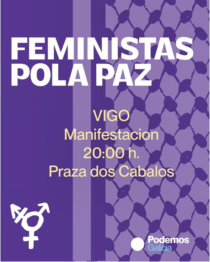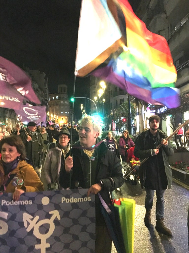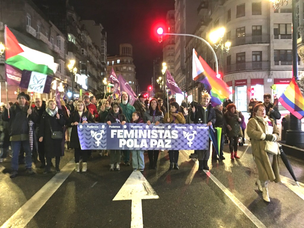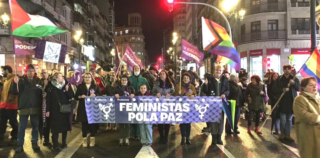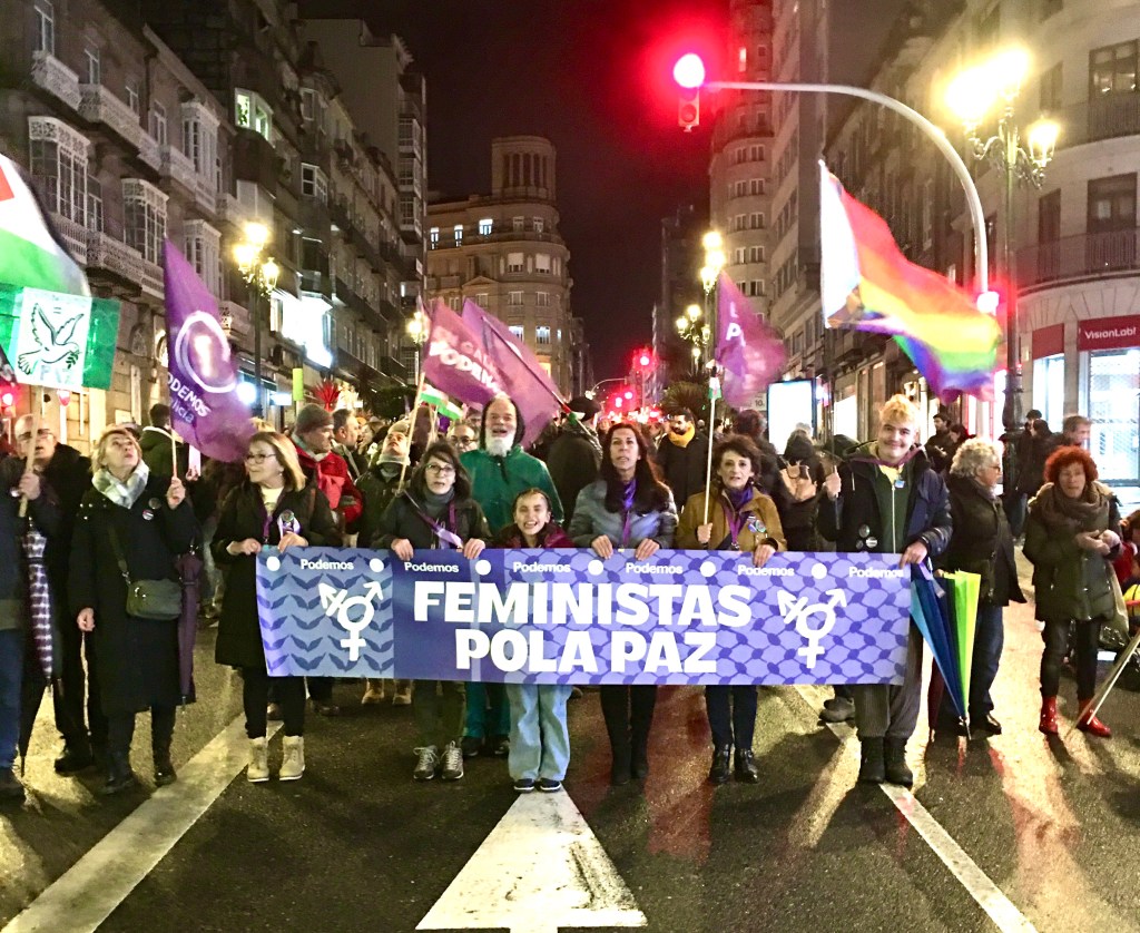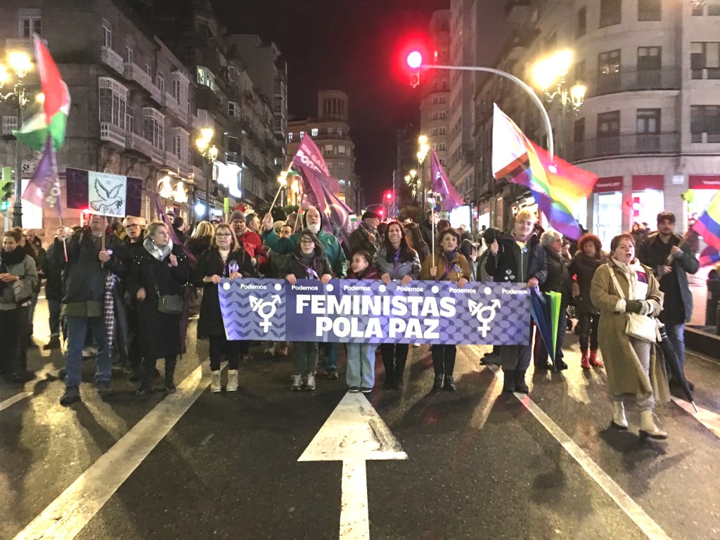 Estivemos na manifestación un gran número de militantes de Podemos Vigo, que berramos lemas feministas, antipatriarcais, antimilitaristas e contra a guerra.